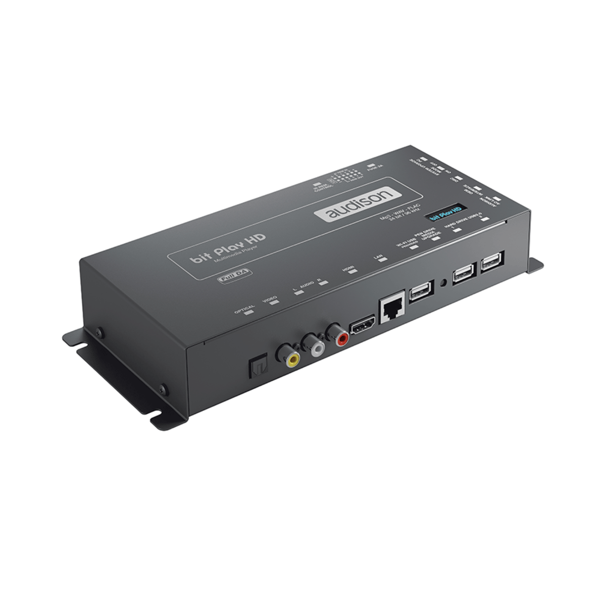 Reproduction of 24 bit / 96 kHz FLAC files taking audio far beyond the CD standards. Digital output to build an Audison Full DA high resolution system and HDMI output. SSD* unit enclosed in a slot with mechanically damped housing for a smooth in-car music reproduction. These and many more are the features which make bit Play HD the object of desire of any car audio enthusiast.